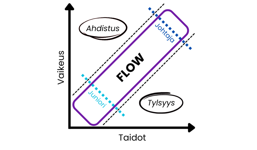 Flow-teoria tunnetaan yleensä yksilön motivaation, hyvinvoinnin ja oppimisen viitekehyksenä. Harvemmin sitä sovelletaan johtamiseen. Mihaly Csikszentmihalyi kuvasi ilmiön, jossa tehtävän haastavuus ja tekijän osaaminen kohtaavat. Liian helppo työ tylsistyttää. Liian vaikea ahdistaa. Näiden väliin jää kapea kaista, jossa syntyy flow – siis tila, jossa ihminen toimii osaamisensa ylärajoilla ja kehittyy nopeimmin. Sovellan seuraavaksi vain teorian tiettyjä osia, eli koko totuus flow-teoriasta ei tule tämän pohdinnan kautta esiin.